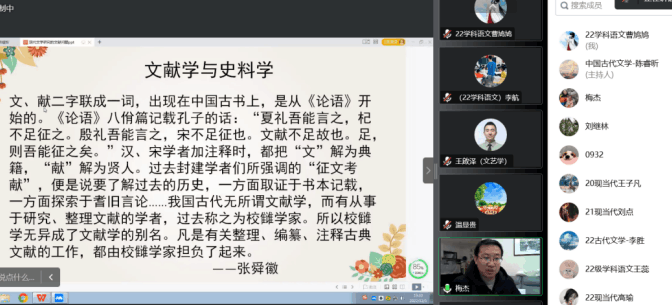 讲座结束后,刘继林老师对梅杰老师的讲座予以简要的总结性评价,对梅杰老师提出的文献研究中应该具备深重的历史感和敏锐的在场感等素质表示十分认同,并对梅杰老师的学术分享表示了衷心的感谢。同学们与梅老师进行了热烈的交流和互动,在场同学无不受到启发,本次讲座圆满结束。