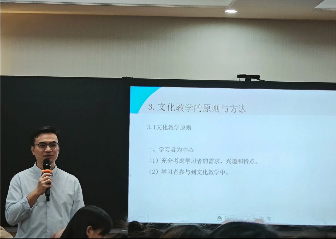 第三部分是文化教学的原则和方法。首先是原则问题,陆老师讲了四点原则,一是以学习者为中心,要充分考虑学习者的需求和兴趣特点,让员工能够参与文化教学中;二是认知学习与体验学习相结合;三是文化教学与语言教学相结合;四是课堂教学与课外文化实践相结合。其次是方法问题。文化教学方法主要有提示与讲解、识别性活动、故事分享、看图说话和课堂讨论等五种。