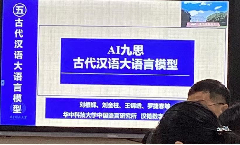 最后,刘根辉教授展示了古代汉语大语言模型“AI”九思,刘教授首先通过一系列例句的导入介绍了什么是语言模型以及大语言模型遇到古代汉语所存在的各种各样的问题。然后提出“AI九思”的研究目标——构建古汉语大语言模型。其中对“AI九思”的命名缘由、研发团队、建构以及应用等相关问题作了阐释。